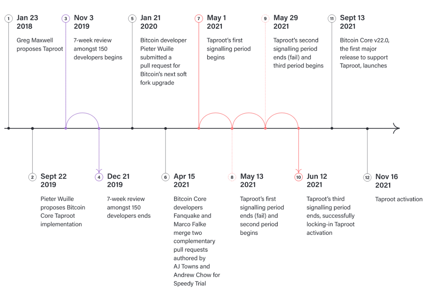 Ähnlich wie bei der kürzlich aktivierten Taproot-Entwicklungsaktualisierung, bei der der Zeitplan der Entwicklung wie folgt aussah:39