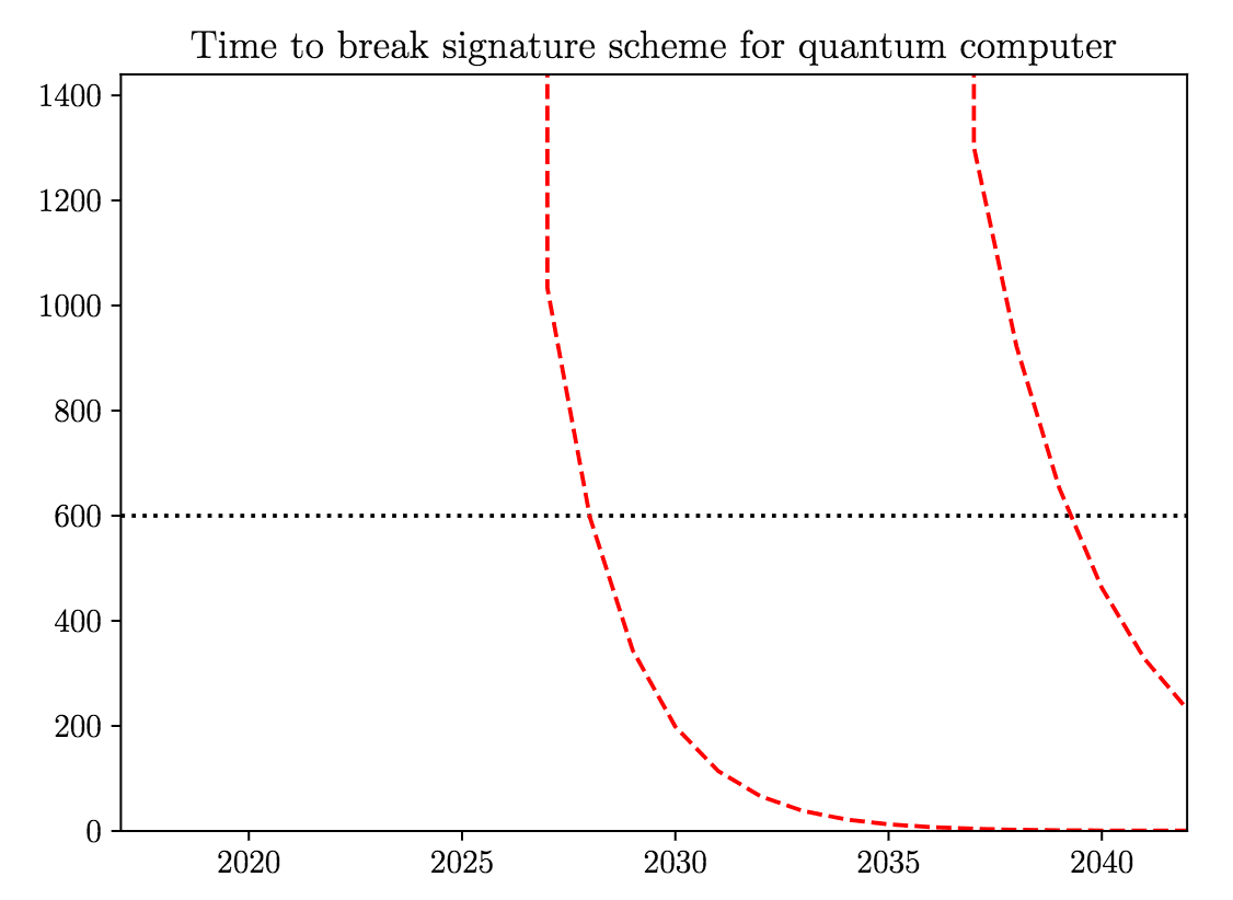 Bereich der Schätzungen (zwischen den rot gestreiften Linien) für die Zeit (in Sekunden), die ein Quantencomputer benötigt, um das Signatursystem für die nächsten 20 Jahre zu knacken. Die durchschnittliche Zeit, die eine Transaktion benötigt, um in den nächsten Block aufgenommen zu werden, beträgt 600 Sekunden (schwarz gestrichelte Linie) – Quelle 47