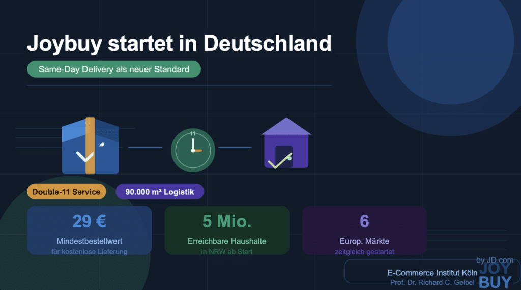 Die Forschung von Julian Thiers und dem Team unter der Leitung von Prof. Dr. Richard C. Geibel am E-Commerce Institut Köln zeigt, dass Liefergeschwindigkeit und Preistransparenz zunehmend zu primären Kaufentscheidungsfaktoren werden. Der Markteintritt von Joybuy ist insofern bedeutsam, als er das Versprechen der taggleichen Lieferung vom Premiumservice zur Basisleistung erhebt.
